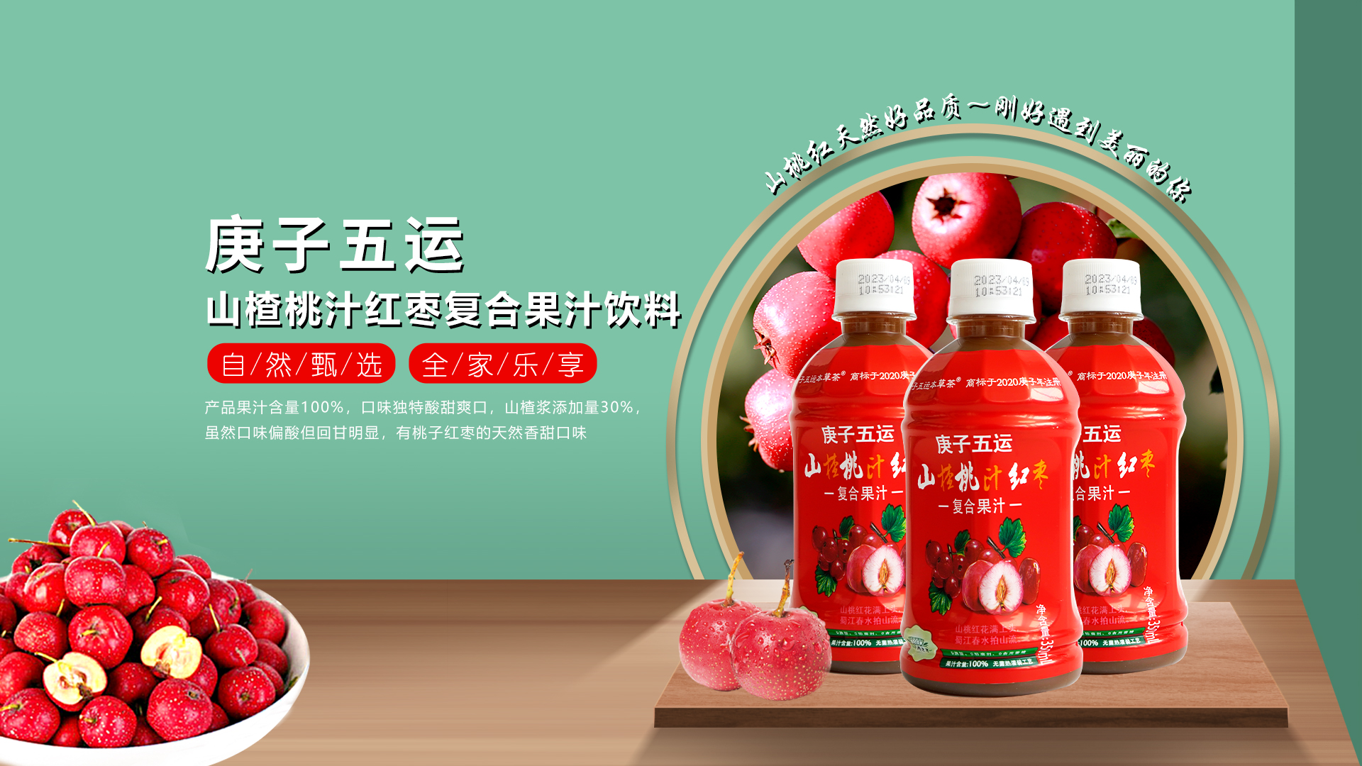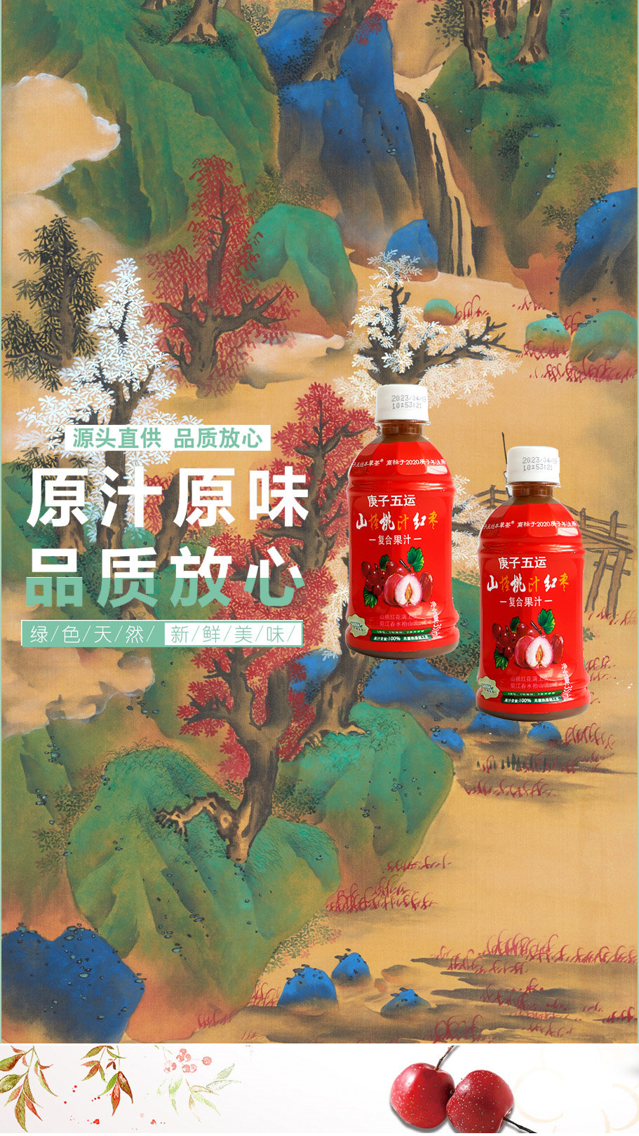 公司首款复合果汁饮料产品,“庚子五运”山楂桃汁红枣复合果汁饮料,果汁含量100%, 口味独特酸甜爽口,山楂浆添加量30%,虽然口味偏酸但回甘明显,有桃子红枣的天然香 甜口味。